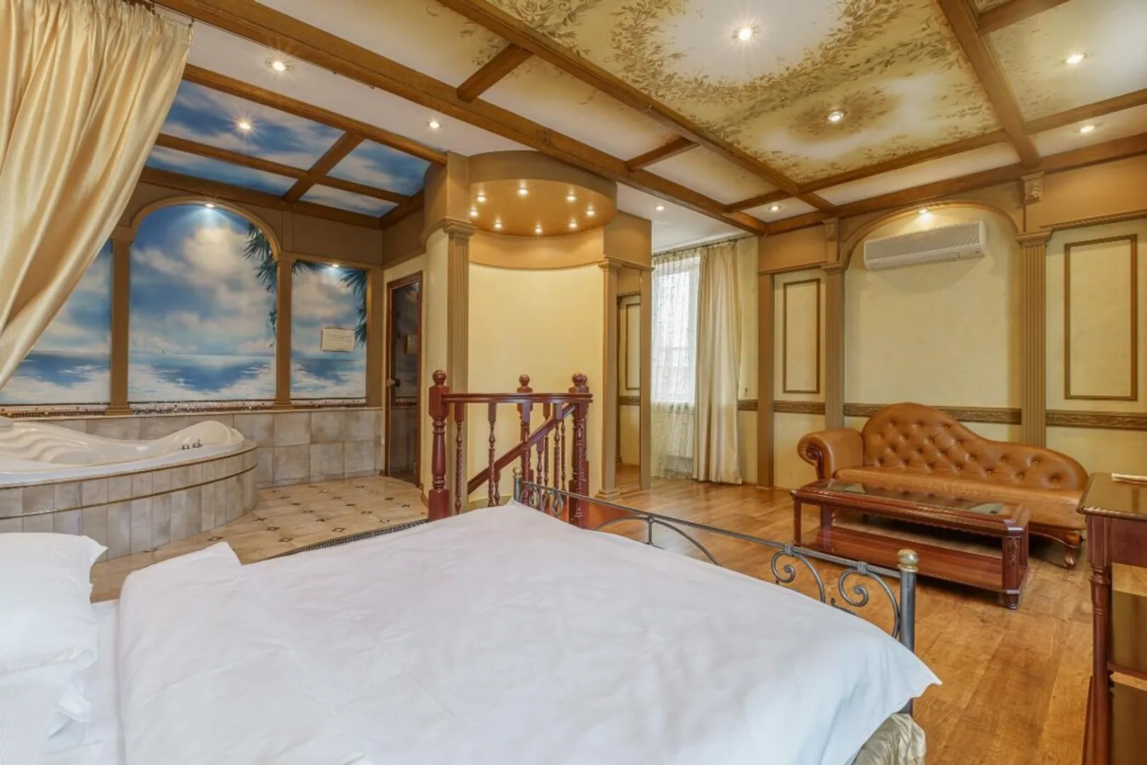 Шикарный двухэтажный номер duplex расположен на третьем этаже отеля площадью 73 кв. м. На первом этаже номера находится гостевая зона и мини-кухня, на втором спальня и джакузи. Максимальное размещение – 2 человека